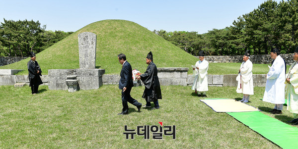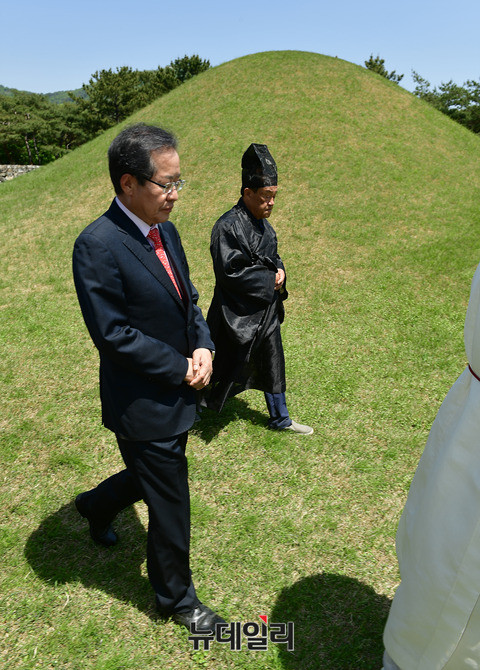 홍준표 자유한국당 대선후보가 29일 오전 경남 김해시 수로왕릉을 찾아 참배후 예를 갖춰 왕릉 앞을 지나고 있다. 이어 홍 후보는 왕릉공원에서 열린 유세 연단에 올라 '추풍령고개'를 열창하며 유세를 시작했다. 이어 이날 오후 경남 양산과 울산, 부산을 각각 찾아 PK(부산·경남) 표심을 공략할 예정이다. (경남 김해=뉴데일리 정상윤 기자)