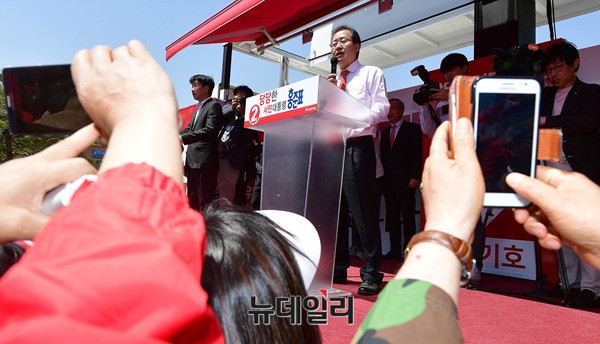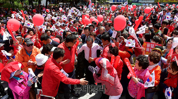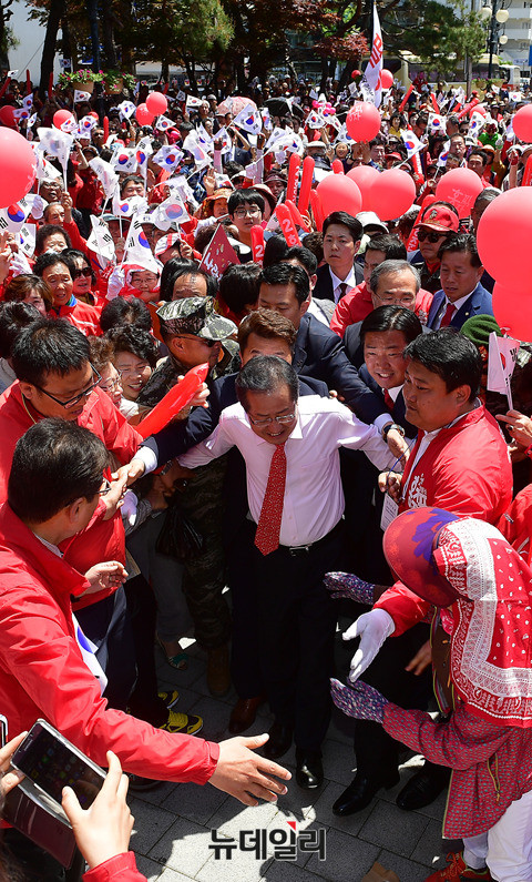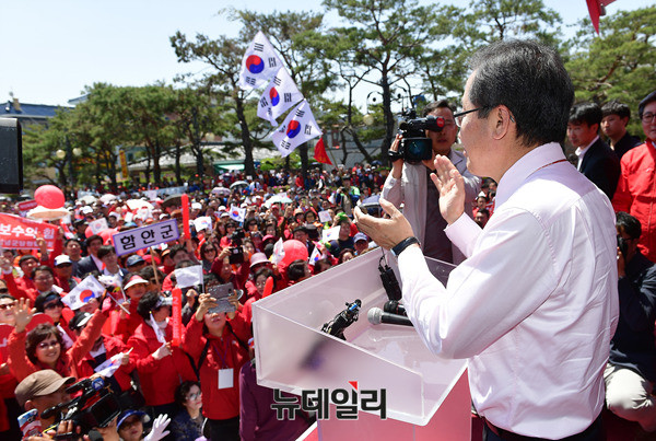 홍준표 자유한국당 대선후보가 29일 오전 경남 김해시 왕릉공원에서 열린 유세장에 환호를 받으며 입장하고 있다. 연단에 오른 홍 후보는 '추풍령고개'를 열창하며 유세를 시작했다. 이어 이날 오후 경남 양산과 울산, 부산을 각각 찾아 PK(부산·경남) 표심을 공략할 예정이다. (경남 김해=뉴데일리 정상윤 기자)