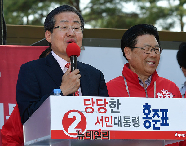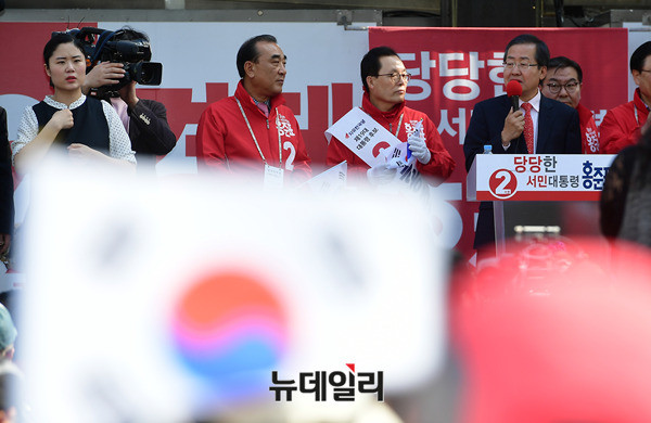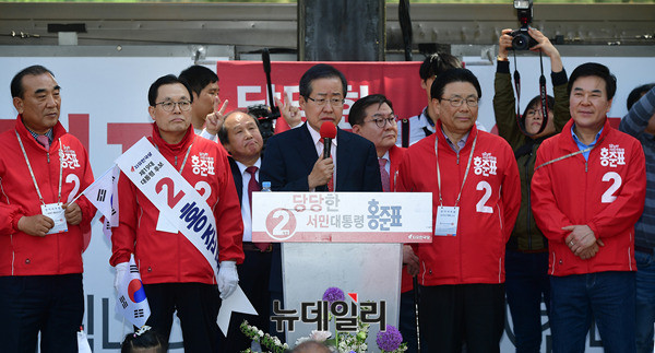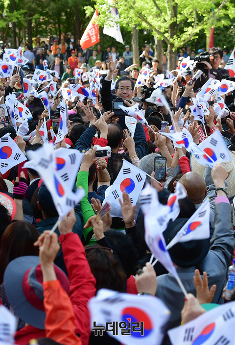 • 홍준표 자유한국당 대선후보가 29일 오후 울산 남구 울산대공원 동문입구에서 유세를 갖고 지지자들의 환호를 받으며 입장하고 있다. 이날 홍 후보는 경남 김해 수로왕릉과 양산을 찾았다. 오후에는 울산과 부산을 각각 찾아 찾아 PK(부산·경남) 표심을 공략할 예정이다. (울산=뉴데일리 정상윤 기자)