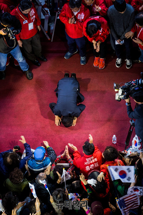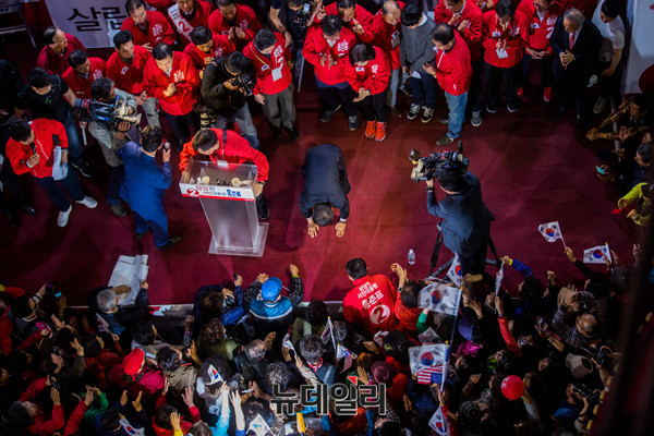 홍준표 자유한국당 대선후보가 29일 오후 부산 북구 덕천로터리 젊음의거리에서 유세 직후 시민들에게 큰절을 올리고 있다. 지지자들은 태극기를 들고 일대거리를 가득 메웠다. 앞서 이날 오전 홍 후보는 경남 김해 수로왕릉과 양산을 찾았다. 오후에는 울산대공원과 부산을 각각 찾아 찾아 PK(부산·경남) 표심을 공략했다. (부산=뉴데일리 정상윤 기자, 사진=공동취재단)