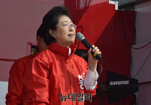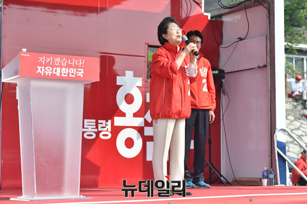 바른정당을 탈당한 이은재 의원이 30일 오후 경기 포천 포천시산림조합앞에서 열린 자유한국당 홍준표 후보 유세에서 홍 후보 지지발언을 하고 있다.