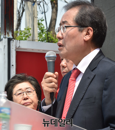 바른정당을 탈당한 이은재 의원이 30일 오후 경기 동두천 큰시장사거리에서 열린 자유한국당 홍준표 후보 유세에서 홍 후보가 아버지에 대한 일화를 말하자 눈물을 흘리고 있다.