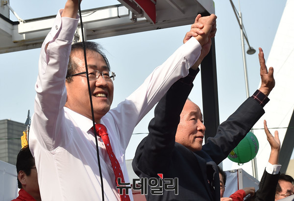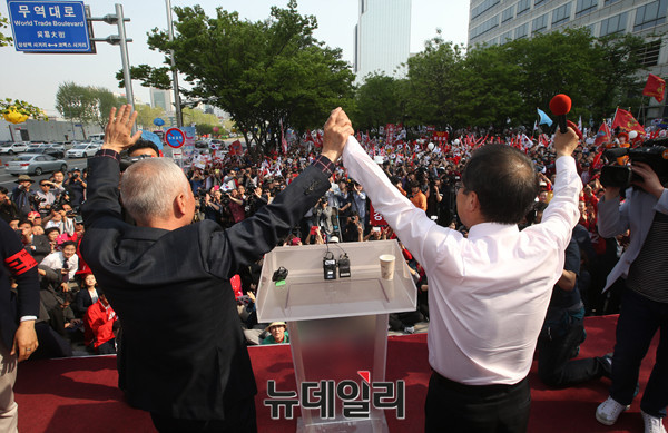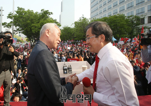 홍준표 자유한국당 대선후보가 30일 오후 서울 강남구 코엑스 앞에서 유세를 펼치는 중 홍 후보 지지선을한 남재준 통일한국당 전 대선후보와 손들어 인사를 하고 있다. 남 전 대선후보는 보수 단일화를 위한 충정으로 홍준표 후보를 지지하며 사퇴한 바 있다.