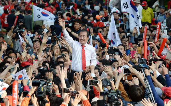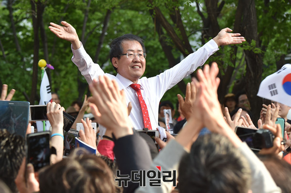 홍준표 자유한국당 대선후보가 30일 오후 서울 강남구 코엑스 앞에서 열린 집중유세에서 지지자들에게 손들어 인사하고 있다.