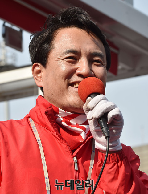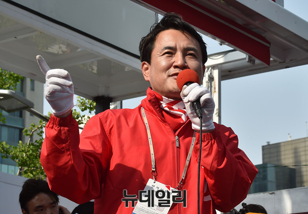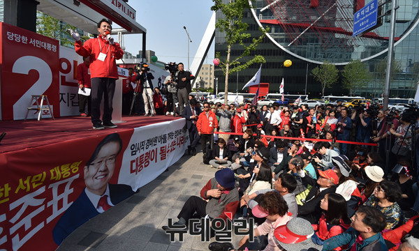 김진태 자유한국당 의원이 30일 오후 서울 강남구 코엑스 앞에서 열린 홍준표 대선후보 집중유세에서 홍 후보의 지지를 호소하고 있다.