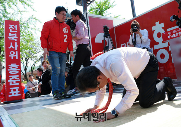 홍준표 자유한국당 대선후보가 1일 오후 전북 전주시 완산구 전동성당 앞에서 유세를 갖고, 모인 시민들에게 큰절을 올리고 있다. 홍 후보는 이날 오후 서대전공원을 찾아 집중 유세를 이어갈 예정이다. (전북 전주=뉴데일리 정상윤 기자)