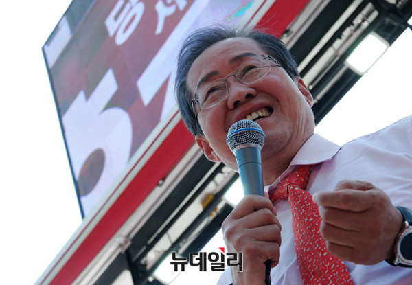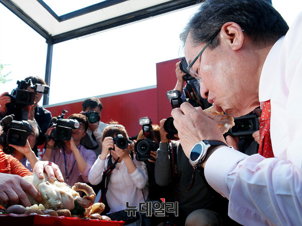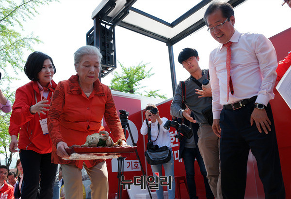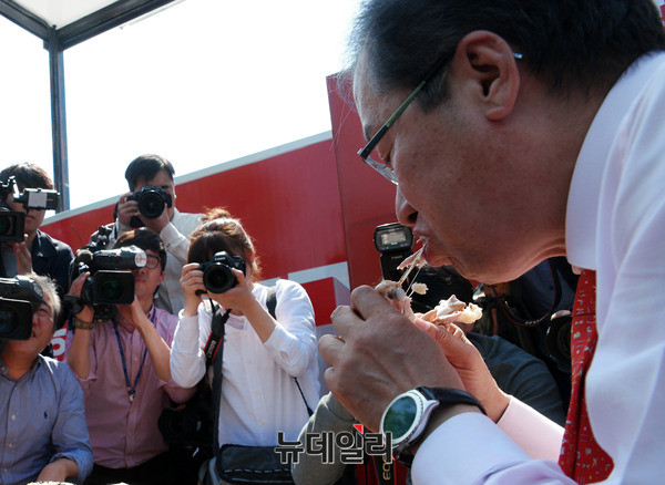 홍준표 자유한국당 대선후보가 1일 오후 전북 전주시 완산구 전동성당 앞에서 유세를 갖고, 장모가 사위에게 씨암탉을 내 놓는 퍼포먼스에서 닭다리를 뜯고 있다. 홍 후보는 이날 오후 서대전공원을 찾아 집중 유세를 이어갈 예정이다. (전북 전주=뉴데일리 정상윤 기자)