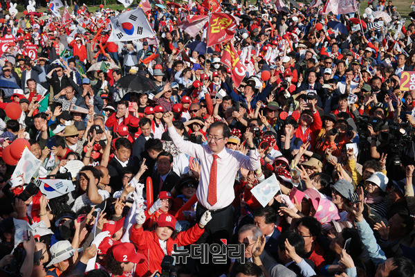 • 홍준표 자유한국당 대선후보가 1일 오후 대전 중구 서대전공원에서 열린 자유대한민국 수호를 위한 충청영남대첩에서 유세 직후 손을 흔들고 있다. 앞서 이날 오전 홍 후보는 제주와 광주를 찾았다. 오후에는 전주와 대전을 각각 찾아 유세를 이어갔다. (대전=뉴데일리 정상윤 기자)