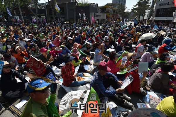 세계노동자대회가 1일 오후 서울 종로구 혜화동 일대에서 열린 가운데 민주노총조합원들이 구호를 외치고 있다.