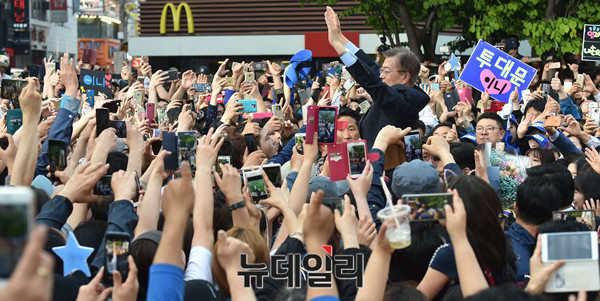 문재인 더불어민주당 대선후보가 1일 오후 경기도 의정부 젊음의 거리에서 열린 집중유세에서 지지자들에게 손들어 인사하고 있다.