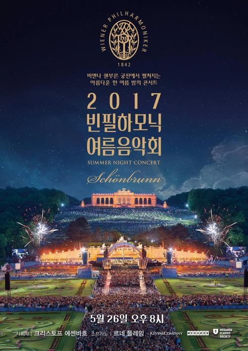 '2017 빈 필하모닉 여름음악회'는 오는 26일 오후 8시 메가박스 14개 지점(코엑스점, 센트럴점, 동대문점, 신촌점, 목동점, 이수점, 킨텍스점, 영통점, 분당점, 하남스타필드점, 광주점, 대전점, 대구점, 부산대점)에서 감상할 수 있다.