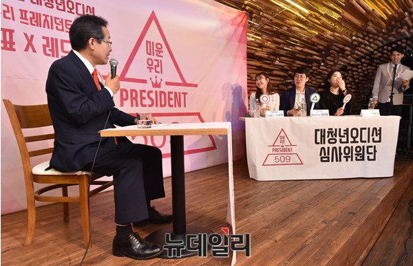 자유한국당 홍준표 대선 후보가 2일 오전 서울 마포구 서교동 한 카페에서 TV프로그램 'SNL 미운우리 프레지던트 509'에서 홍 후보를 연기한 '레드준표' 개그맨 정이랑씨와 만남에 앞서 청년공약을 발표하고 평가 받는 시간을 갖고 있다.