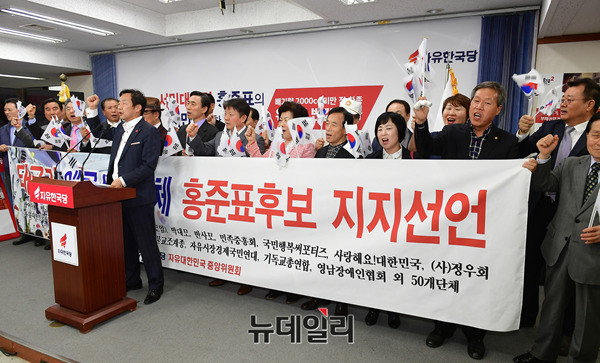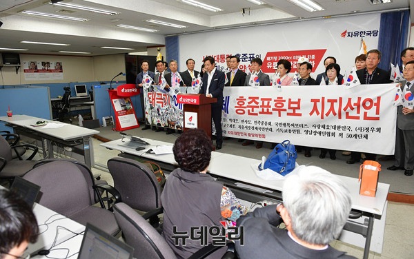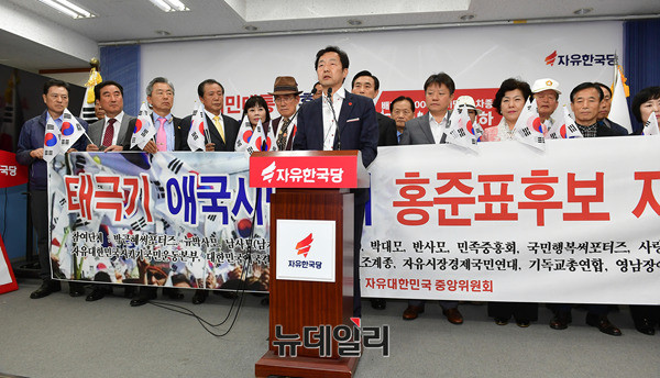 태극기애국시민으로 구성된 50여 단체가 2일 오후 서울 여의도 자유한국당사에서 홍준표 대선후보 지지 기자회견을 열고 "박근혜 대통령 탄핵으로 인한 흩어진 민심을 수습하고, 보수대통합을 선언해 즉시 실천에 옮기길 바란다"고 말했다. 이어 "자유애국진영 모두를 포용할 수 있는 대책을 하루빨리 수립하고, 박근혜 전 대통령이 하루속히 불구속 상태에서 재판을 받을 수 있게 해달라"고 주장했다.