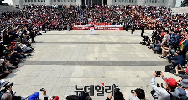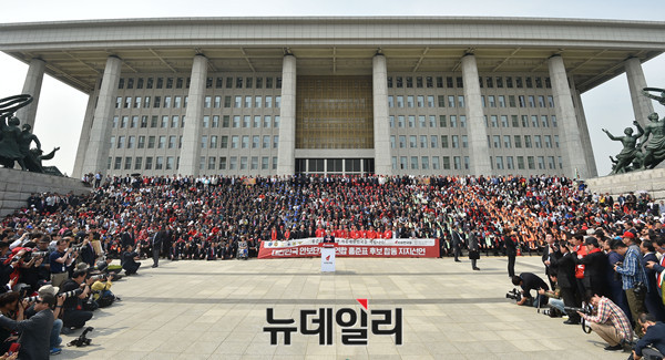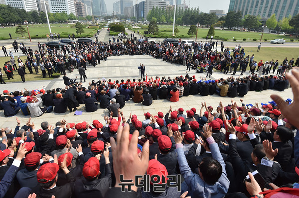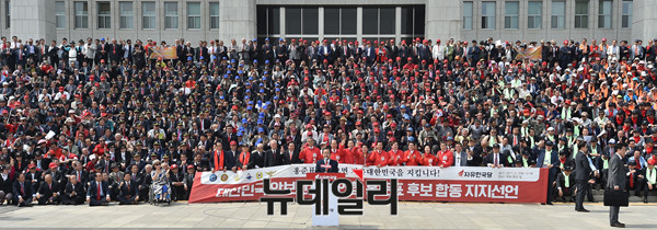 홍준표 자유한국당 대선후보가 2일 오후 국회 본청 앞에서 열린 '대한민국 안보단체 총연합 합동지지선언'에서 발언하고 있다. 이날 홍 후보는 보수안보단체로부터 대한민국 안보 사령관으로 임명 받았다.
