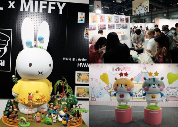 국내 최대 아트토이 전시회 '아트토이컬쳐 2017'의 화려한 막이 올랐다.가나아트센터와 아트벤처스가 주최하는 제4회 '아트토이컬쳐 2017'이 3일 코엑스 B홀에서 개막했다.3일부터 7일까지 5일간 열리는 이번 전시회는 국내외 유명 아티스트 180팀 230여 명이 참가해 전 세계 다양한 아트토이를 소개한다. 올해는 참여 작가들의 작업물 영상과 다양한 단편 애니메이션 상영 등 볼거리가 더욱 풍성해졌다.전시장 내 이벤트 무대에서 세계 각국 비보이, DJ, 디자이너, 포토그래퍼로 구성된 아티스트 '킵잇스테디(Keep it steady)'의 공연과 인기 디자인 그룹 스티키몬스터랩의 사인회가 열린다. 오후 5시부터는 일본 작가 데빌로봇, 아트정키 등이 라이브 페인팅을 선보인다.5일은 어린이날을 맞아 인기 유투버 '셀프어쿠스틱'의 스톱모션 체험, 아이큐 박스 체험 '나만의 플레이 모빌 만들기' 등 무료체험 이벤트가 하루 종일 펼쳐진다. 자세한 일정은 페이스북(https://www.facebook.com/arttoyculture )을 참고하면 된다.박근형 아트토이컬쳐 총괄 디렉터는 "아트토이컬쳐는 전 세계 유명 아트 토이와 작가를 한 자리에서 만날 수 있어 온 가족이 즐기기에 제격"이라며 "다양한 이벤트를 많이 준비했으니 꼭 아이들과 함께 방문하기 바란다"고 말했다.