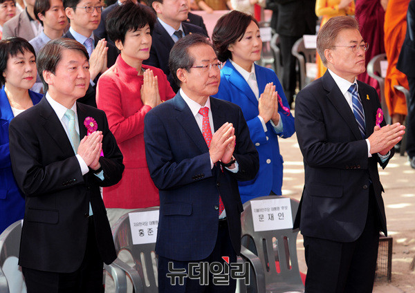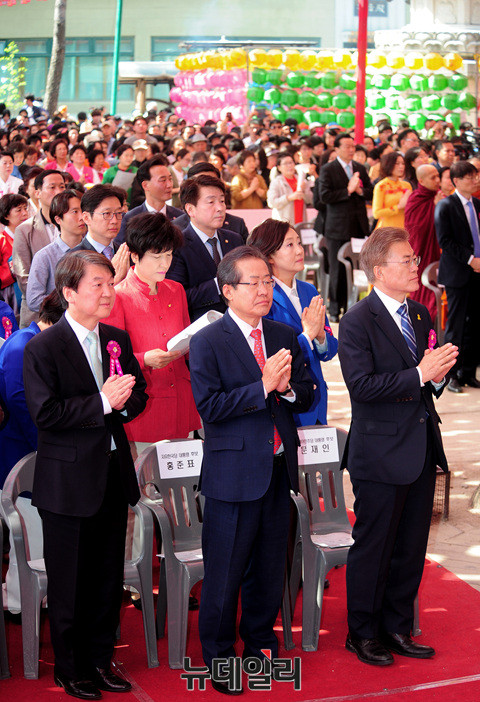안철수 국민의당, 홍준표 자유한국당, 문재인 더불어민주당 대선후보(왼쪽부터)가 3일 오전 서울 조계사에서 열린 불기 2561년 부처님오신날 봉축 법요식에 참석해 합장을 하고 있다. 이후 홍준표 후보는 부산과 대구 안철수 후보는 익산, 김제, 전주, 남원 문재인 후보는 창원과 진주에서 각각 유세에 나설 예정이다.