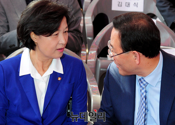 추미애 더불어민주당 상임선대위원장과 주호영 바른정당 대표 권한대행 겸 원내대표가 3일 오전 서울 조계사에서 열린 불기 2561년 부처님오신날 봉축 법요식에 참석해 악수를 나누고 있다.