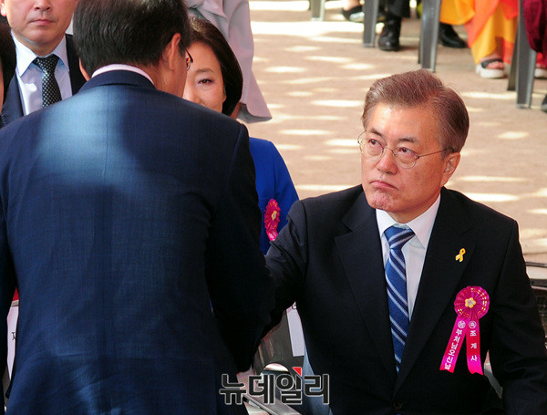 홍준표 자유한국당, 문재인 더불어민주당 대선후보가 3일 오전 서울 조계사에서 열린 불기 2561년 부처님오신날 봉축 법요식에 참석해 악수를 나누고 있다. 이후 홍 후보는 부산과 대구 문 후보는 창원과 진주에서 각각 유세에 나설 예정이다.