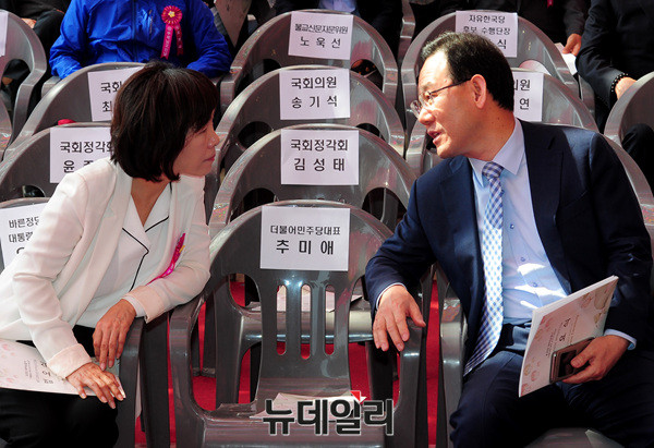 유승민 바른정당 대선후보의 부인인 오선혜씨(왼쪽)와 주호영 바른정당 대표 권한대행 겸 원내대표가 3일 오전 서울 조계사에서 열린 불기 2561년 부처님오신날 봉축 법요식에 참석해 대화를 나누고 있다.
