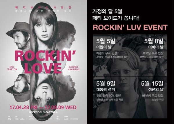 '패티보이드 사진전'이 5월 가정의 달을 맞아 통 크게 쏜다.다양한 할인에 무료입장을 제공하는 'Rockin’ Luv Event'는 오는 5일 어린이날을 시작으로 한 달간 계속된다.5일에는 초등학교 6학년에서 유아의 어린이들은 모두 무료입장 가능하며, 8일 어버이날 자녀와 부모님이 함께 전시를 관람하게 될 경우 부모가 무료입장할 수 있다.이어 9일 '19대 대통령 선거일'에 선거참여 인증샷을 제시하면 50% 할인 혜택을 제공한다. 15일 성년의 날에는 신분증 기준으로 1998년생은 무조건 무료 관람할 수 있다.'패티보이드 사진전'은 이외에도 얼리버드들을 위한 '해피아워' 이벤트(평일/주말 11시~1시 입장 시 3천원 할인), 대학생 50% 할인 입장, 재관람 50% 할인 등 오는 11일부터 다양한 '락킹 럽 이벤트'를 진행한다.오는 11일에는 전시 개막 2주를 기념해 단 하루 동안 공식 예매처인 인터파크티켓에서 50% 할인 입장권을 한정 판매할 예정이다.'패티보이드 사진전; ROCKIN’ LOVE'가 준비한 이벤트의 자세한 소식은 페이스북과 인스타그램을 통해 확인할 수 있으며, 신분증 지참은 필수이다.[사진=빅제이엔터테인먼트]