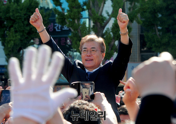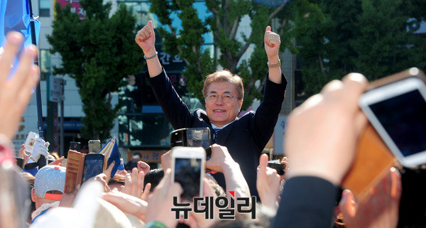 문재인 더불어민주당 대선후보가 3일 오후 경남 창원시 마산합포구 문화광장에서 만세를 하고 있다.