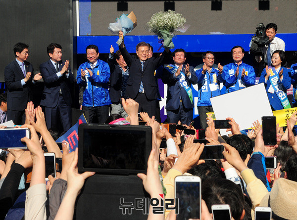 문재인 더불어민주당 대선후보가 3일 오후 경남 창원시 마산합포구 문화광장에서 꽃을 들고 만세를 하고 있다.