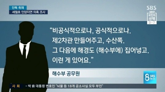 앞서 'SBS 8뉴스'는 익명의 해양수산부 관계자를 통해 "해수부가 세월호 인양을 고의로 지연, 차기 정권과 거래를 시도한 정황이 있다"고 보도해 논란을 불러 일으켰다.
