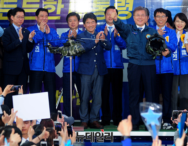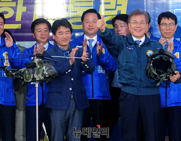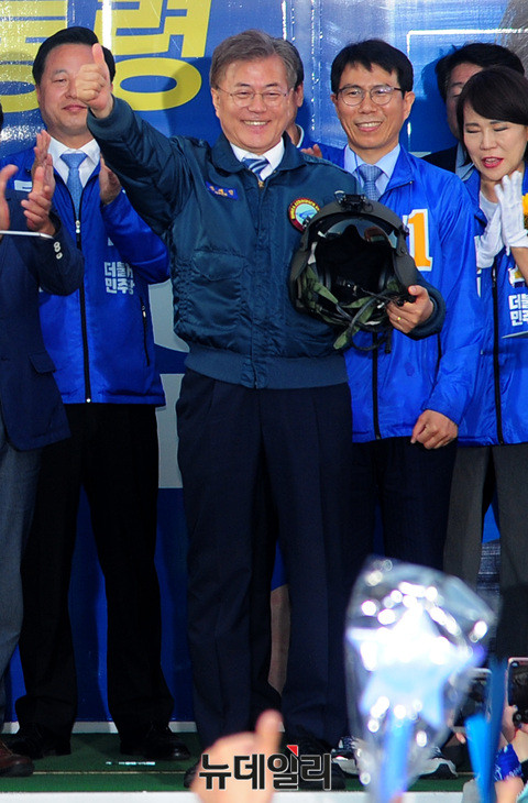 문재인 더불어민주당 대선후보가 3일 오후 경남 진주시 대안동 차없는거리에서 공군 조종사복을 입고 엄지를 세워 보이고 있다.