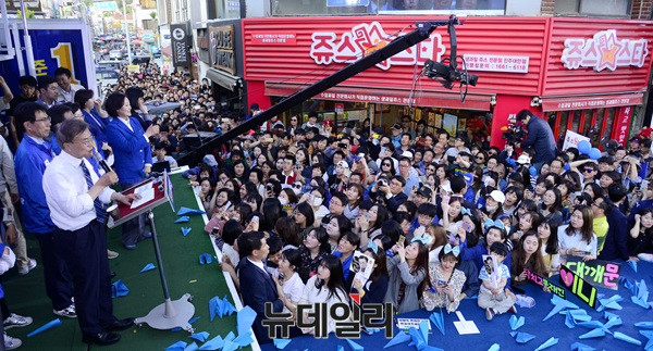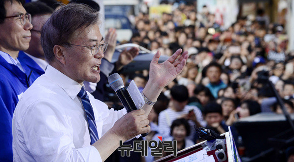 문 후보는 앞서 서울 조계사에서 열린 부처님오신날 봉축 법요식에 참석 후 여의도 중앙당사에서 사전투표 참여 독려 기자회견을 가졌다. 이어 경남 창원시를 찾아유세에 나섰다. (경남 진주=뉴데일리 공준표 기자, 사진=공동취재단)