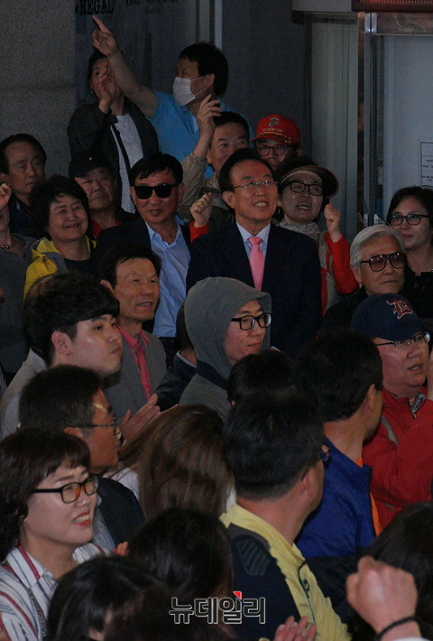 김관용 경북지사가 3일 오후 대구 중구 동성로 대구백화점 앞 광장에서 열린 홍준표 자유한국당 대선후보 유세에서 인파속에서 홍 후보의 연설을 지켜보고 있다. 이날 홍 후보의 유세 전 김평우 전 박근혜 대통령 변호인도 참석해 짧은 인사말을 전했다.