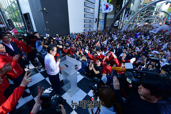 홍준표 자유한국당 대선후보가 3일 오후 부산 중구 비프광장에서 열린 거점유세에서 연단에 올라 지지연설을 하자 비프광장을 메운 지지자들이 태극기를 흔들며 환호하고 있다. 홍 후보는 이날 연설을 통해 "선거운동 마지막 날인 8일 오후 부산역 광장을 다시 찾겠다"고 밝혔다. 홍 후보는 부산에 이어 대구 동성로를 찾아 대구 거점유세를 이어갔다. (부산=뉴데일리 정상윤 기자)