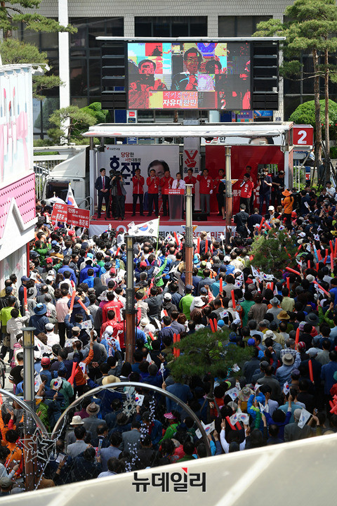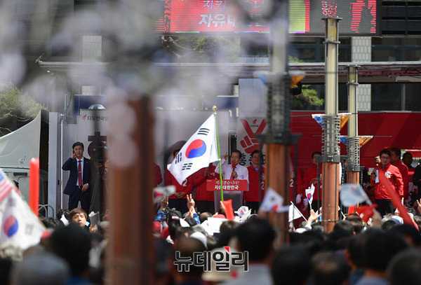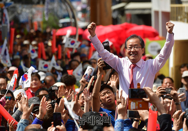 홍준표 자유한국당 대선후보가 사전투표가 시작된 4일 오전 경북 안동시 중앙로를 찾아 지지를 호소하고 있다. 홍 후보는 이날 경북 안동을 시작으로 영주와 충북 단양, 제천, 충주와 강원 동해를 찾아 유세를 이어갈 예정이다. (경북 안동=뉴데일리 정상윤 기자)