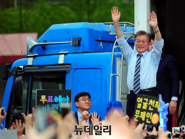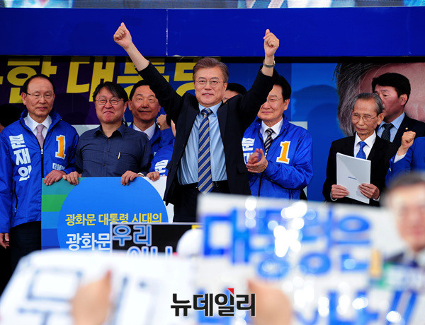 문재인 더불어민주당 대선후보가 4일 오후 경기도 고양시 일산 문화광장에서 만세를 하고 있다.문 후보는 앞서 서울 코엑스 SM아티움에서 열린 '비상하라 한류문화콘텐츠 : 현장의 목소리를 듣다' 간담회에 참석해 문화인들과 한류 문화 발전 방안 등을 논의했다. (경기 고양=뉴데일리 공준표 기자)