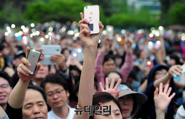 문재인 더불어민주당 대선후보가 4일 오후 경기도 고양시 일산 문화광장에서 휴대전화 플래쉬 퍼포먼스를 하고 있다.