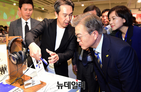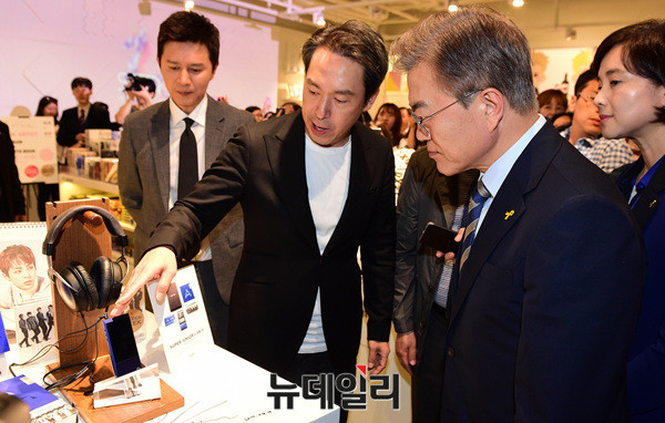 문재인 더불어민주당 대선후보가 4일 오후 서울 코엑스 SM아티움에서 열린 '비상하라 한류문화콘텐츠 : 현장의 목소리를 듣다' 간담회에 앞서 SM 콘텐츠 상품 판매샵을 들러 김영민 사장으로부터 상품에 대한 설명을 듣고있다. 문 후보는 이어 경기도 고양시를 찾아 유세에 나섰다. (사진=공동취재단)