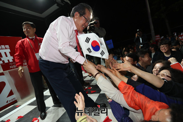 홍준표 자유한국당 대선후보가 4일 오후 강원 동해시 천곡로에서 열린 거점유세에서 빗자루로 쓰레기를 청소하는 퍼포먼스를 선보이고 있다. 홍 후보는 이날 오전 경북 안동과 영주를 찾았다. 오후에는 충북 단양의 구인사와 충주, 제천을 각각 찾아 유세를 이어갔다. (강원 동해=뉴데일리 정상윤 기자, 사진=공동취재단)