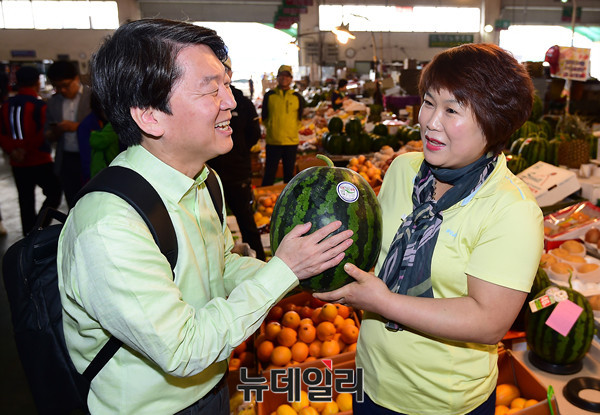 안철수 국민의당 대선후보가 6일 오전 광주광역시 북구 각화동 농산물 도매시장을 찾아 상인들과 인사를 나누고 있다.