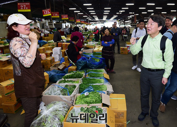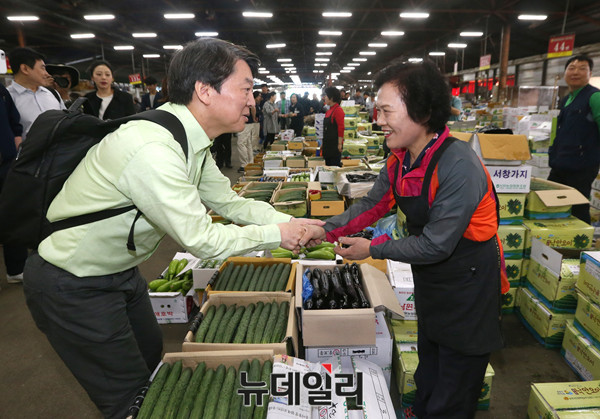 안철수 국민의당 대선후보가 6일 오전 광주광역시 북구 각화동 농산물 도매시장을 찾아 상인들과 인사를 나누고 있다.