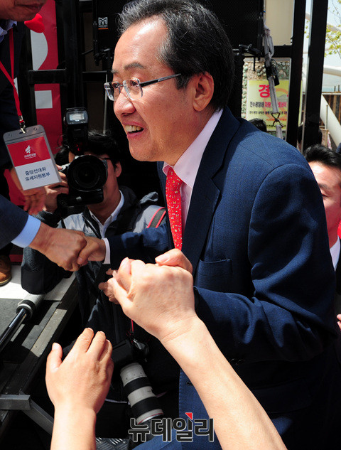 홍준표 자유한국당 대선후보가 6일 오후 인천 월미도 문화의거리에서 시민들의 손을 잡고 연단에 오르고 있다. 홍 후보는 앞서 여의도 중앙당사에서 국민대결집 대국민호소 기자회견을 가진 후 경기 고양, 부천을 방문해 유세에 나섰다. 이어 경기 시흥, 안산 상록수역, 충남 공주대학교에서 유세에 나설 예정이다. (인천=뉴데일리 공준표 기자)