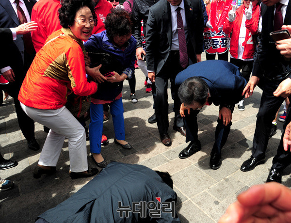 홍준표 자유한국당 대선후보가 6일 오후 인천 월미도 문화의거리에 유세를 위해 입장하던 중 한 시민이 홍 후보에게 큰절을 하고 있다. 홍 후보는 앞서 여의도 중앙당사에서 국민대결집 대국민호소 기자회견을 가진 후 경기 고양, 부천을 방문해 유세에 나섰다. 이어 경기 시흥, 안산 상록수역, 충남 공주대학교에서 유세에 나설 예정이다. (인천=뉴데일리 공준표 기자)