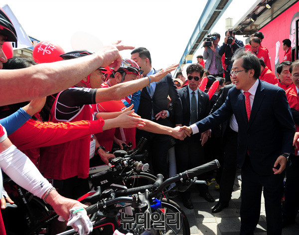 홍준표 자유한국당 대선후보가 6일 오후 인천 월미도 문화의거리에서 유세 후 자전거 동오회원들과 악수를 나누고 있다. 홍 후보는 앞서 여의도 중앙당사에서 국민대결집 대국민호소 기자회견을 가진 후 경기 고양, 부천을 방문해 유세에 나섰다. 이어 경기 시흥, 안산 상록수역, 충남 공주대학교에서 유세에 나설 예정이다. (인천=뉴데일리 공준표 기자)