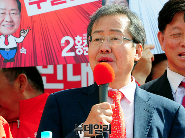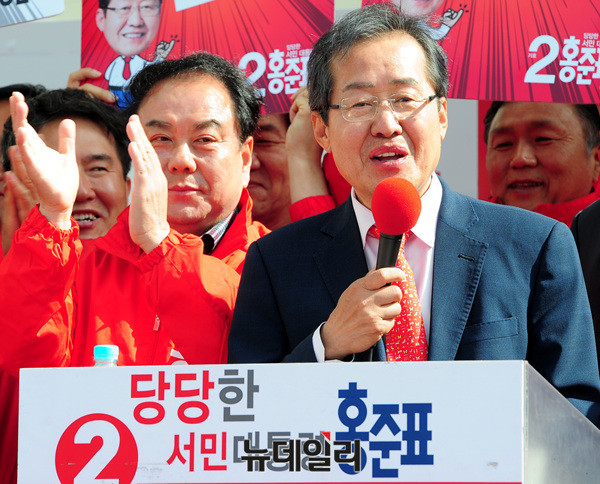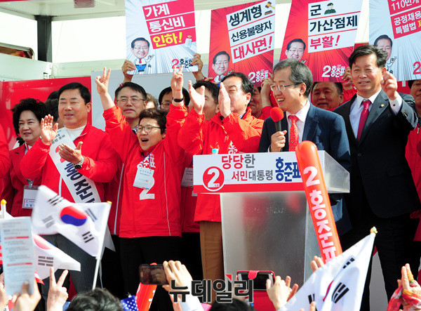 홍준표 자유한국당 대선후보가 6일 오후 경기도 안산시 상록수체육관 앞에서 발언하고 있다. 홍 후보는 앞서 여의도 중앙당사에서 국민대결집 대국민호소 기자회견을 가진 후 경기 고양, 부천, 인천, 시흥에서 유세에 나섰다. 이어 충남 공주대학교에서 유세에 나섰다. (경기 안산=뉴데일리 공준표 기자)