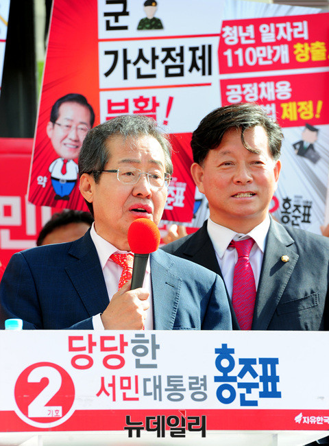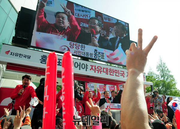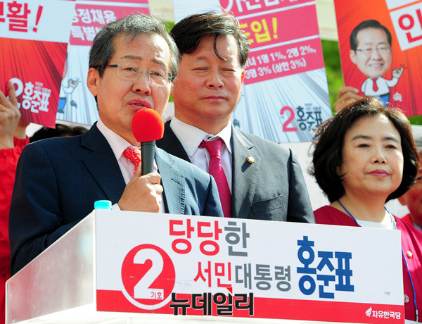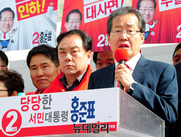 홍 후보는 앞서 여의도 중앙당사에서 국민대결집 대국민호소 기자회견을 가진 후 경기 고양, 부천, 인천, 시흥에서 유세에 나섰다. 이어 충남 공주대학교에서 유세에 나섰다. (경기 안산=뉴데일리 공준표 기자)