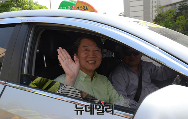 [포토] 택시 타고 이동하는 안철수 국민의당 대선후보