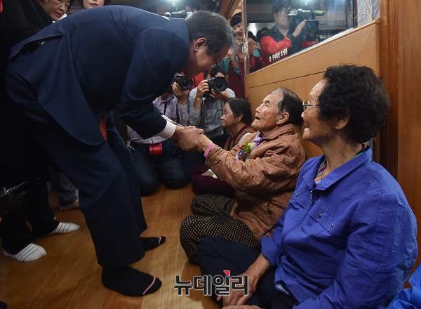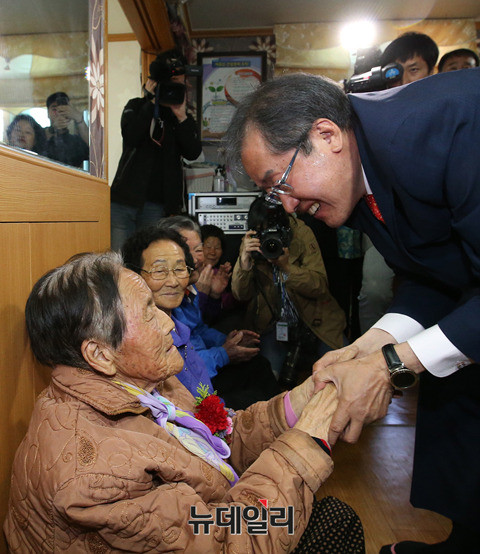 홍준표 자유한국당 대선후보가 어버이날을 하루 앞 둔 7일 오전 경남 거제시 장동경로당을 방문해 어르신께 카네이션을 달아 드리고 있다. 홍 후보는 이날 PK(부산·경남) 지역을 돌며 표심을 공략할 예정이다. (경남 거제=뉴데일리 정상윤 기자, 사진=공동취재단)