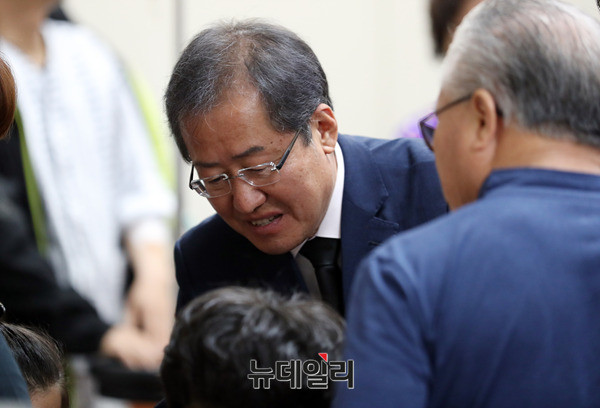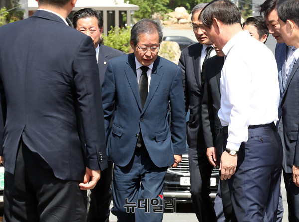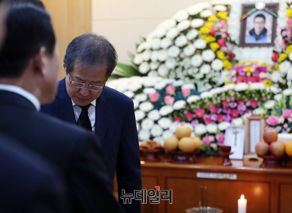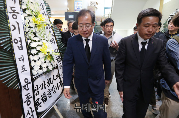 자유한국당 홍준표 대선후보가 7일 오전 삼성중공업 크레인사고 희생자 빈소가 차려진 경남 거제시 거붕백병원을 찾아가 조문하고 있다. 홍 후보는 이날 부산·울산·경남 지역을 돌며 표심을 공략할 예정이다. (경남 거제=뉴데일리 정상윤 기자, 사진=공동취재단)