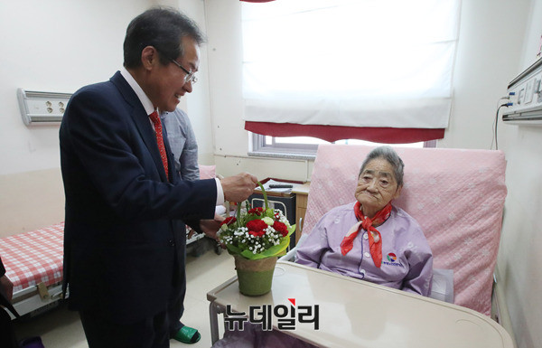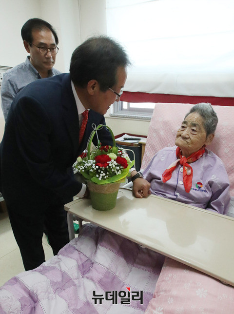 홍준표 자유한국당 대선 후보가 어버이날을 하루 앞둔 7일 오전 경남 통영시 경남도립통영노인전문병원에 입원중인 위안부 피해자 김복득(100세) 할머니 방문를 방문해 카네이션꽃을 전달하고 있다.홍 후보는 "할머니 어버이날 앞두고 찾아 뵈었습니다. 건강하십시요"라고 인사말을 전했다. (경남 통영=뉴데일리 정상윤 기자, 사진=공동취재단)