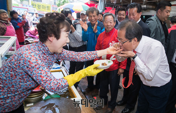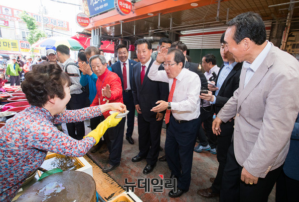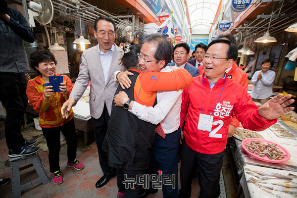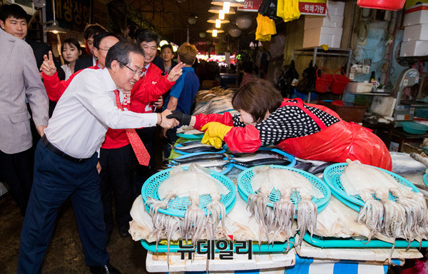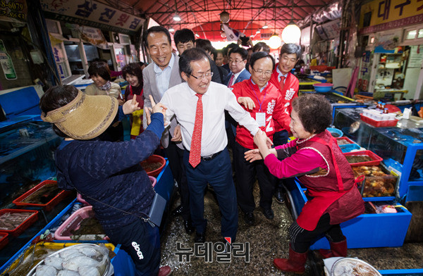자유한국당 홍준표 대선후보가 7일 오후 경남 창원시 마산어시장을 방문해 상인들과 인사를 나누고 있다. 홍 후보는 이날 부산·울산·경남 지역을 돌며 표심을 공략할 예정이다. (경남 창원=뉴데일리 정상윤 기자, 사진=공동취재단)