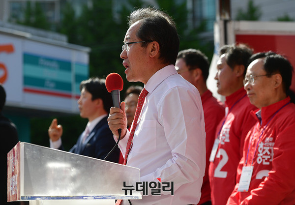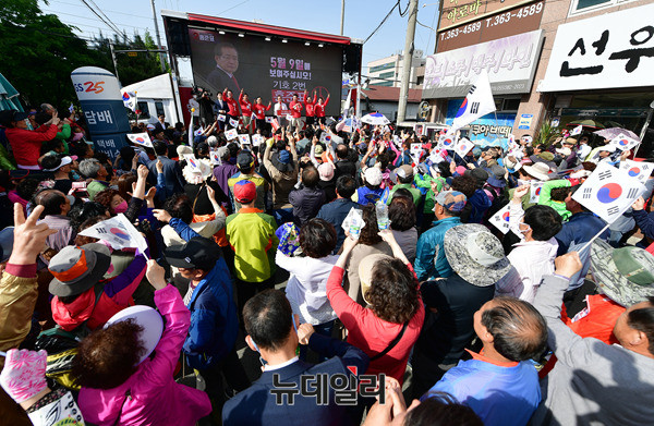 홍준표 자유한국당 대선후보가 7일 오후 경남 양산시 평산동음악공원 입구에서 지지를 호소하고 잇다. 홍 후보는 이날 부산·울산·경남 지역을 돌며 PK 표심을 공략했다. (경남 양산=뉴데일리 정상윤 기자)