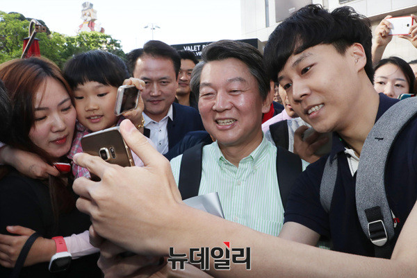 안철수 국민의당 대선후보가 7일 오후 잠실역 앞에서 열린 '걸어서 국민속으로' 도보유세에서 시민과 사진을 촬영하고 있다.